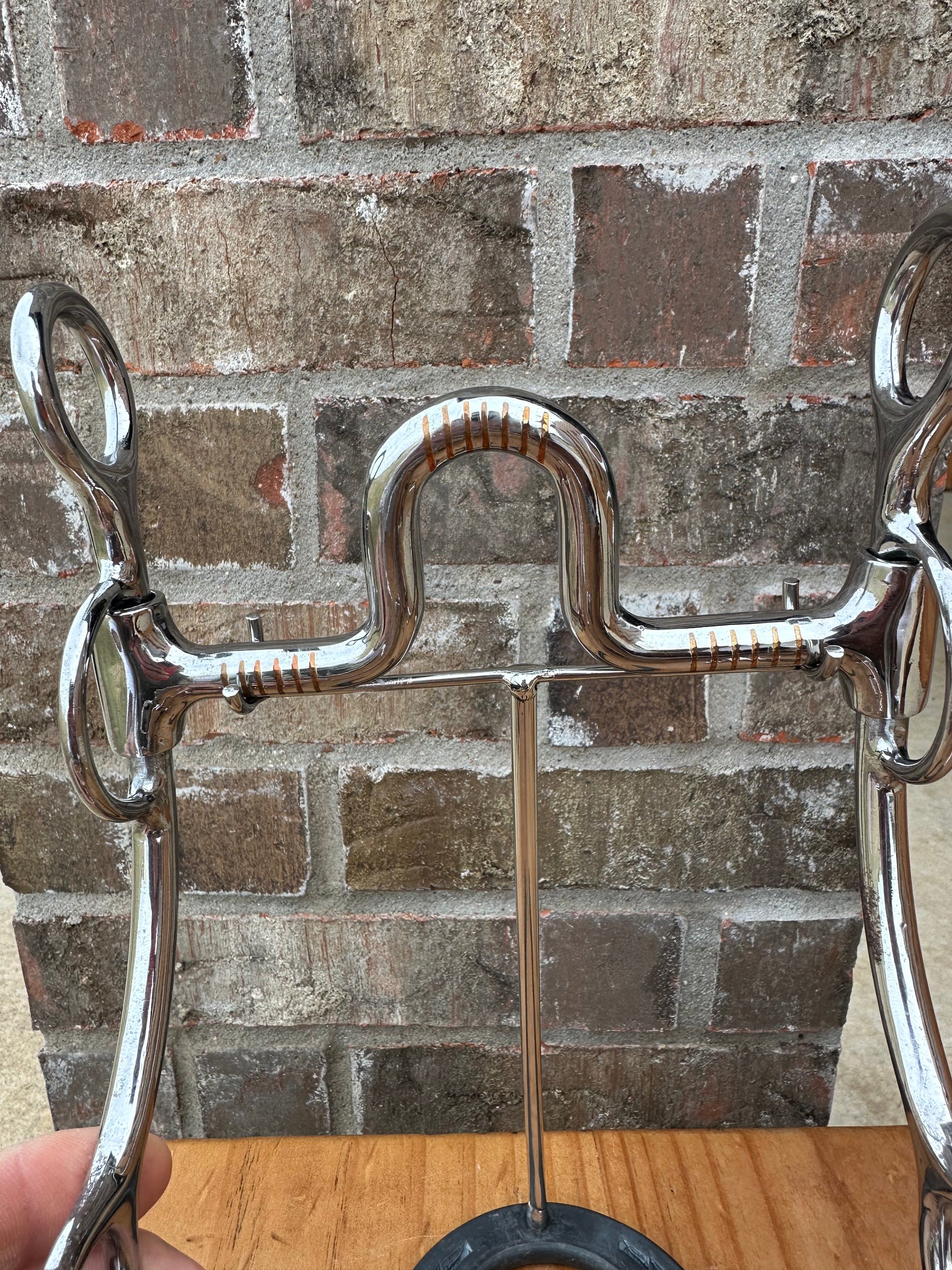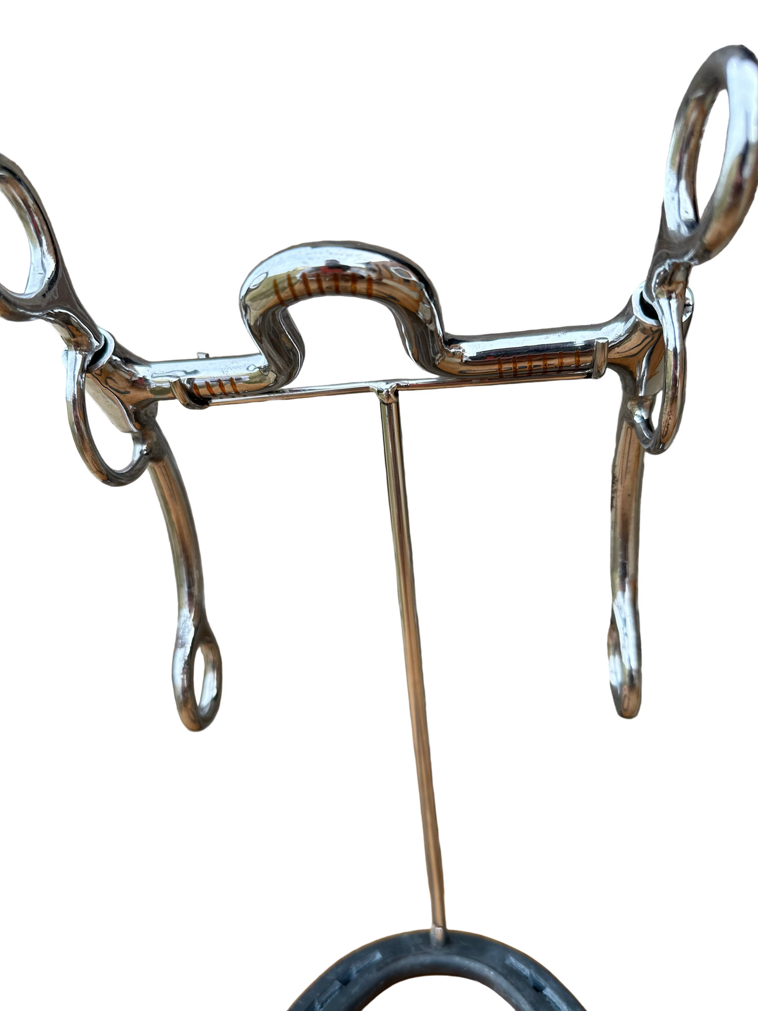 Our working bit collection simply means no artwork on the shanks, but every other aspect has all of Rancho Rodriguez details to size and weight to establish contact with your horse and deliver clear signals. This working bit collection has a pass through swivel cheek style and will patina (rust out) beautifully with time, meaning this entire bit will oxidize. Copper inlaid stripes on the tongue side of the mouthpiece to keep the mouth moist. Swept back shanks with large O rings and plenty of weight to it!