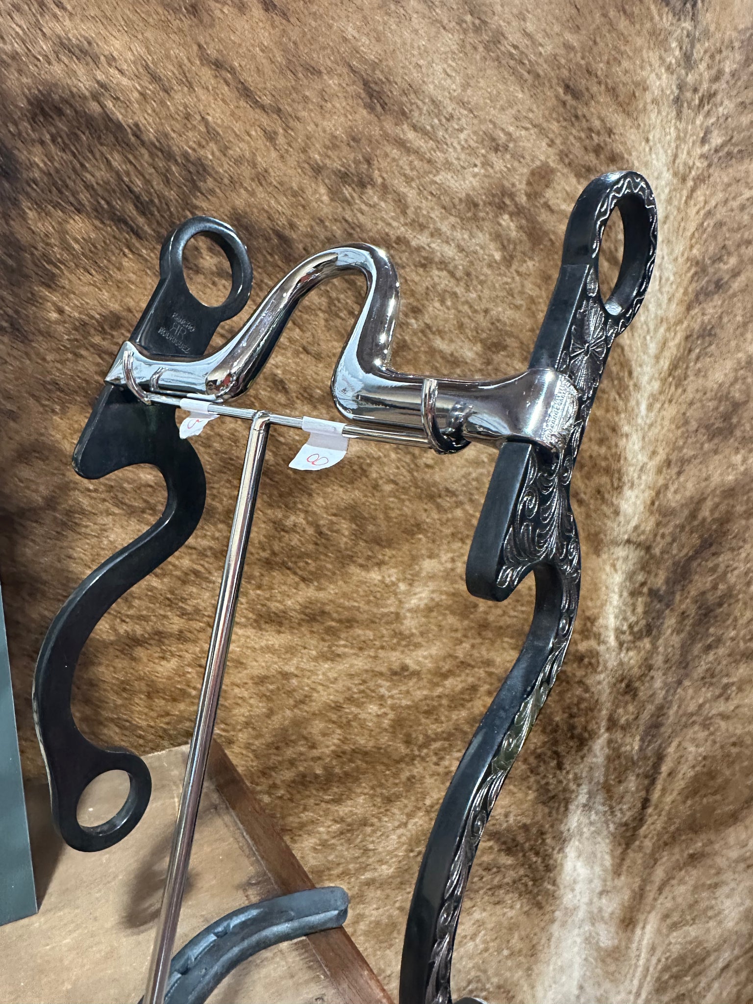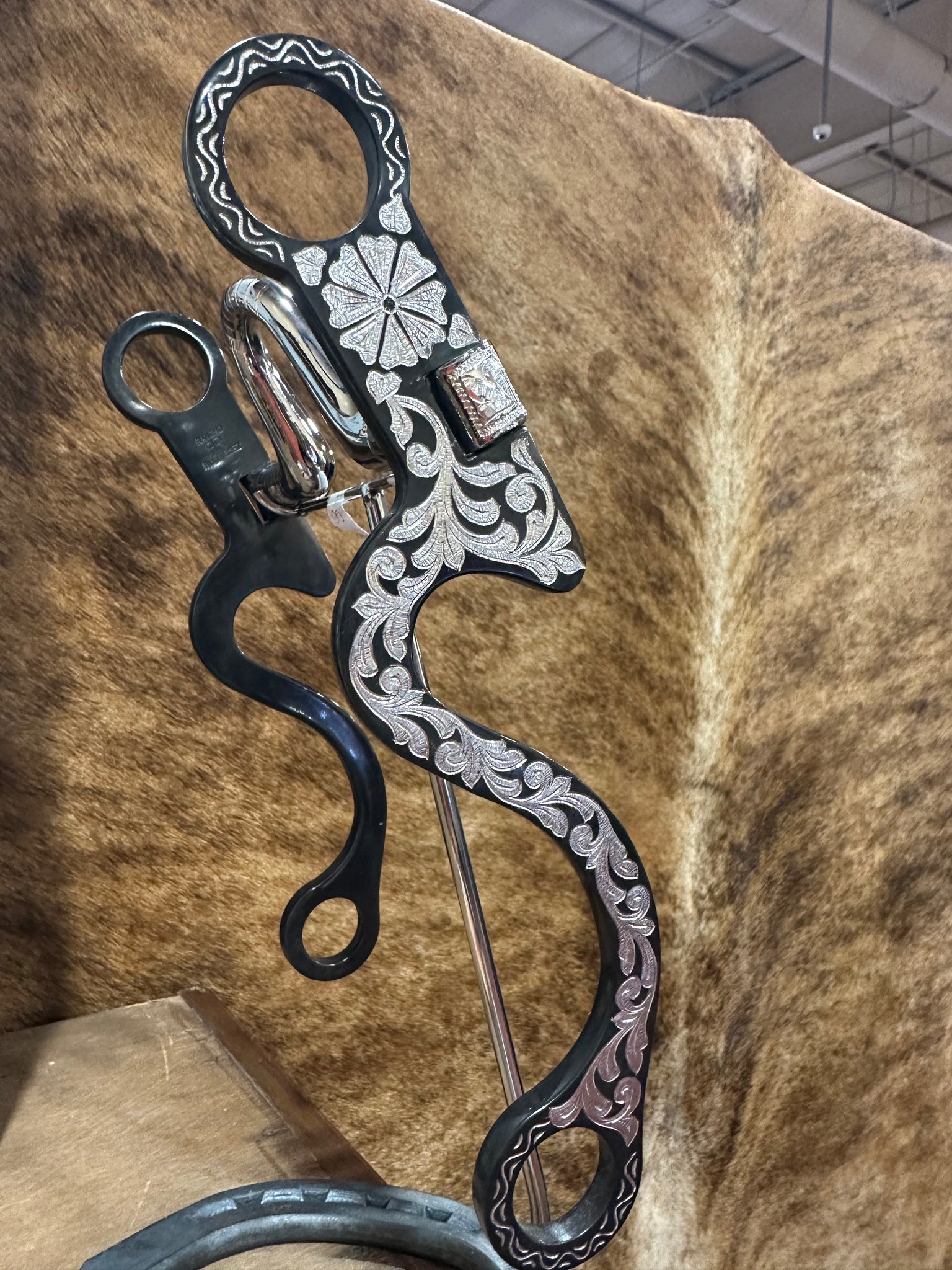 We called it "El Bonito" because it is pretty and has a pretty price tag. This is a hand etched artistry bit at a decent price. These are swivel cheeks with gorgeous engraved artistry but its the functionality that is worth the money. Copper inlay stripes for salivation on the mouth and wide tongue relief port. The bars are 9/16" diameter giving plenty of mass. The weight is contact to help avoid needing to us heavy hands, the mass of the bit is the communication, its not how hard you pull. It's a beauty but the price and artistry are just the eye appeal, the function is the value!