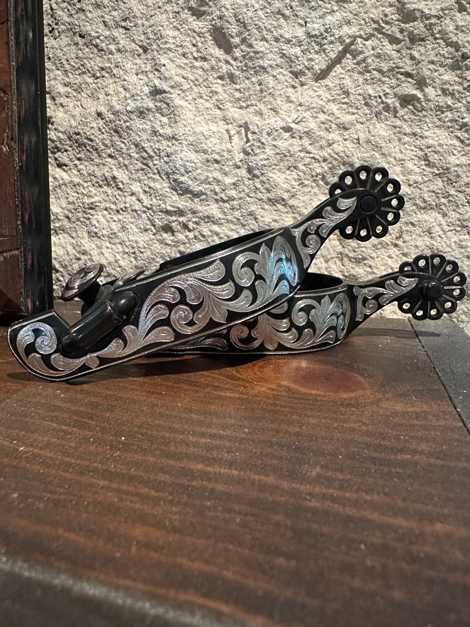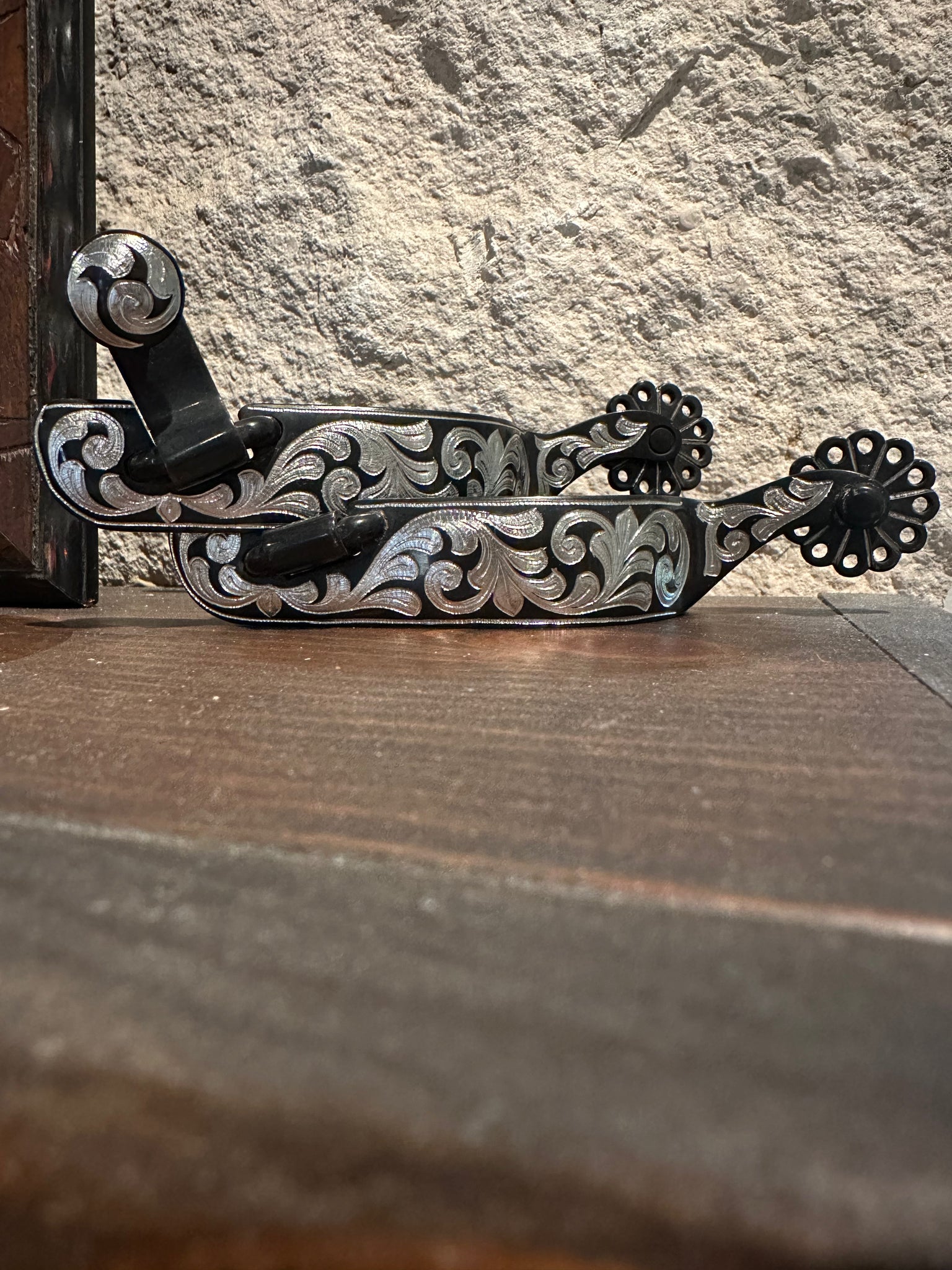 "Fancy" are a hand floral etched/engraved double mounted set on oxidized stainless steel. They are double mounted with a soft (no point) rowel, we call the rowel "fancy". This is a smaller size spur liked by many team ropers due to the small rowel and short shank. The size is for ladies or small men, even bigger kids. Completely handmade and very well balanced.