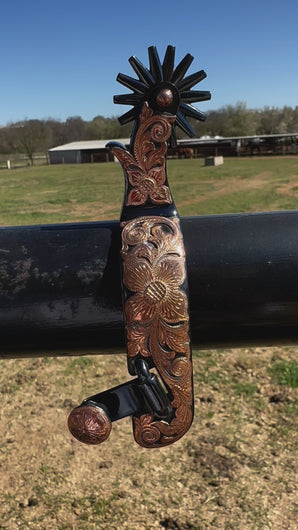 We finished them in multiple style craftsmanship - Copper, Etched and German Silver, even added some brass to a few of them. Our Copper and German Silver artwork are completely cut by hand and welded on to the spur bands. No machine stamping out the designs, completely by hand! As always the finishing touches of rowel pins to match and spur buttons completely artist finished are always Rancho Rodriguez standards of craftsmanship. The photo shows the other finishes, the first photo is the actual spur being purchased. Call with any questions, thanks!