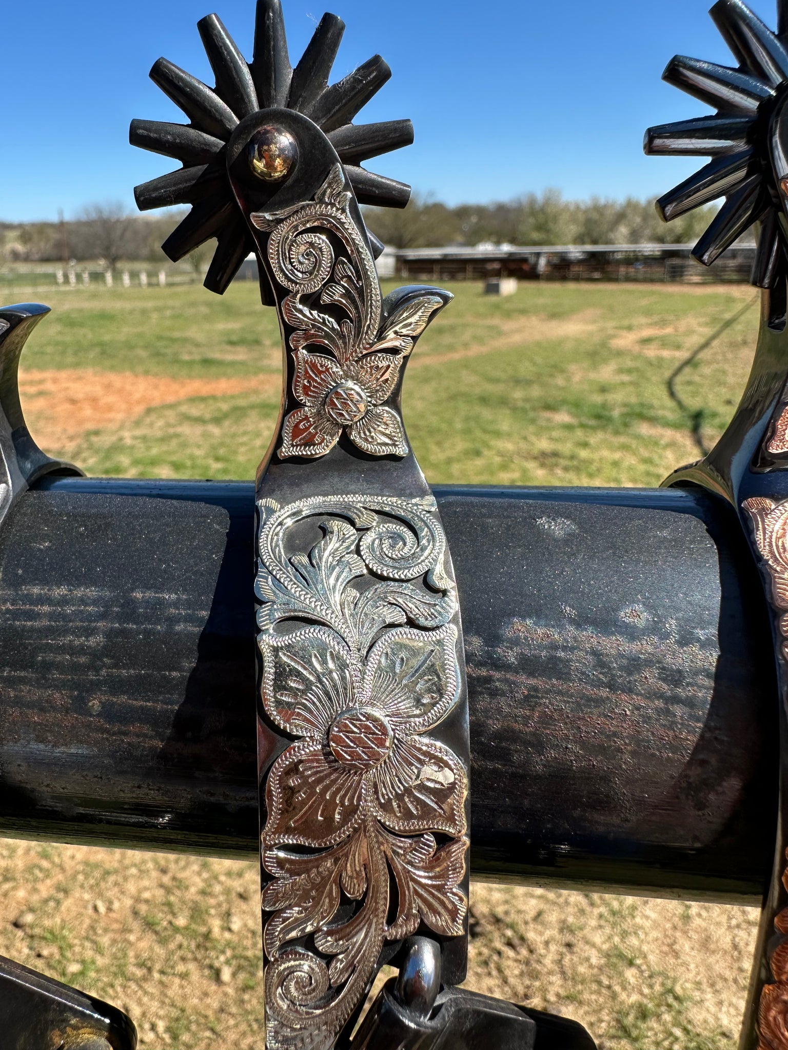 We finished them in multiple style craftsmanship - Copper, Etched and German Silver, even added some brass to a few of them. Our Copper and German Silver artwork are completely cut by hand and welded on to the spur bands. No machine stamping out the designs, completely by hand! As always the finishing touches of rowel pins to match and spur buttons completely artist finished are always Rancho Rodriguez standards of craftsmanship. The photo shows the other finishes, the first photo is the actual spur being purchased. Call with any questions, thanks!