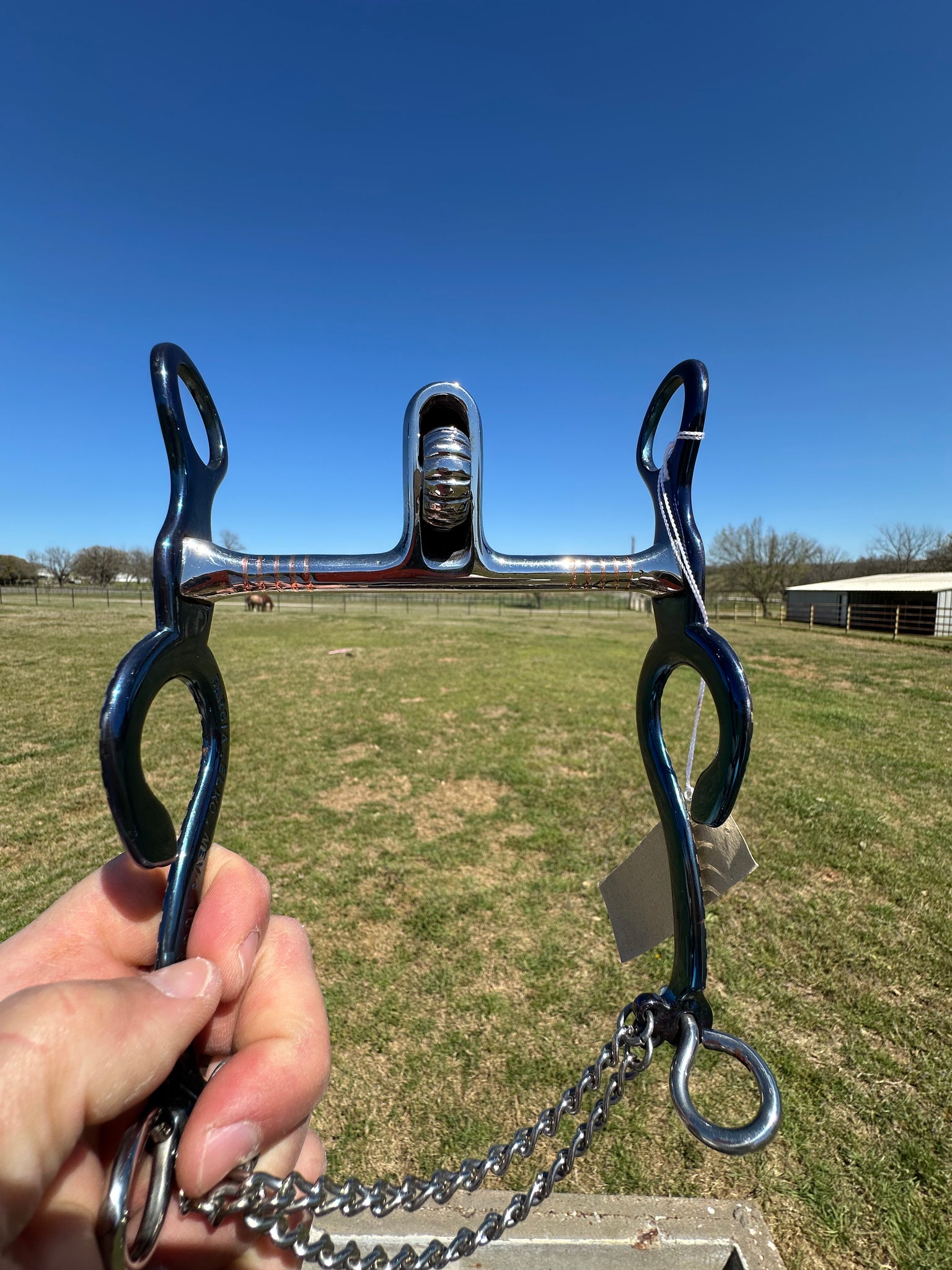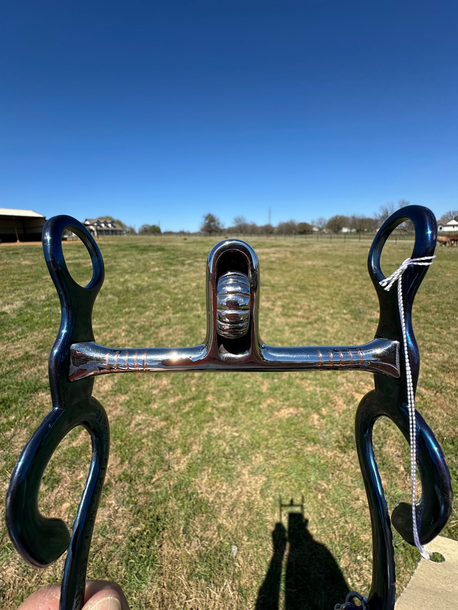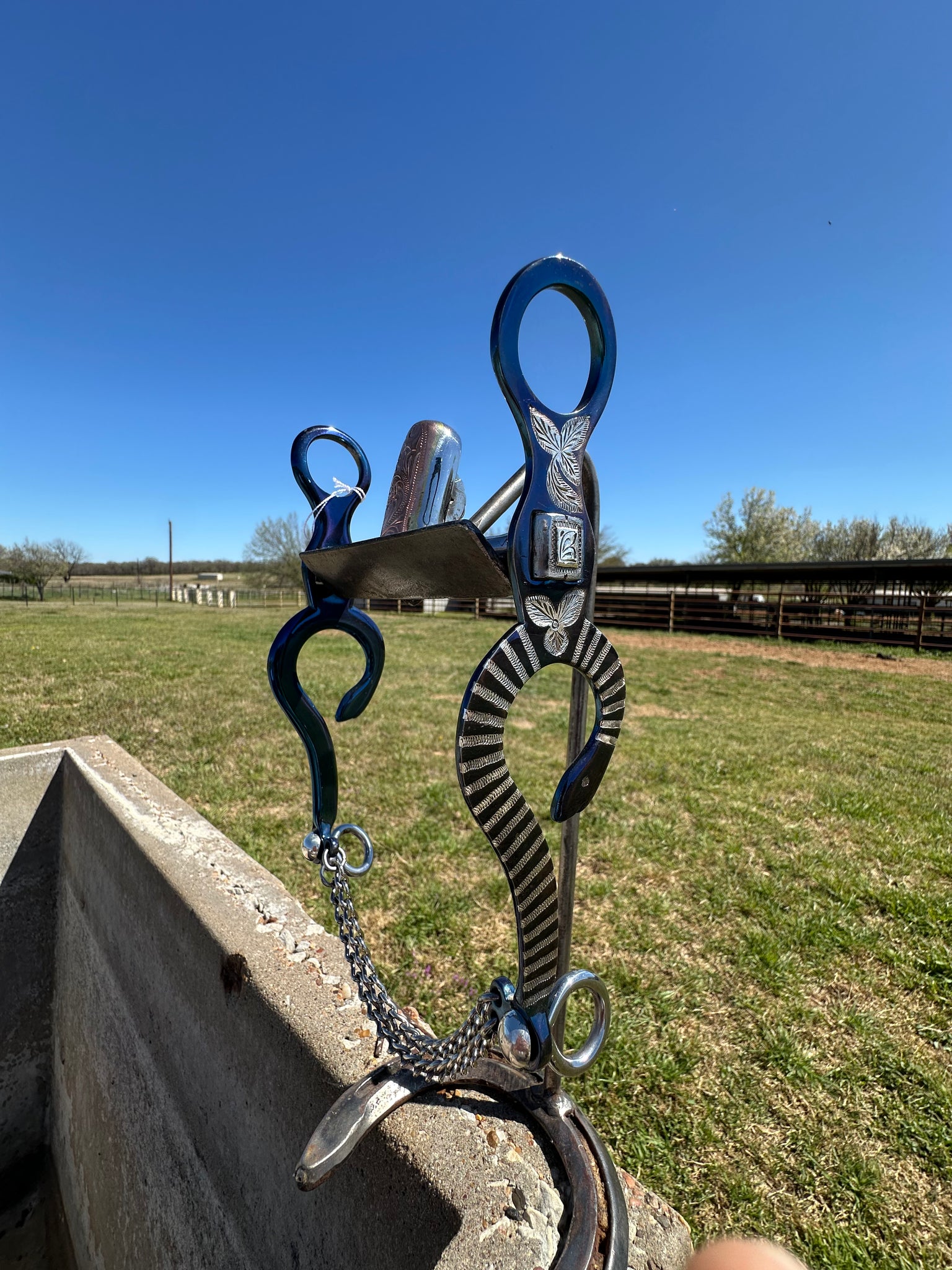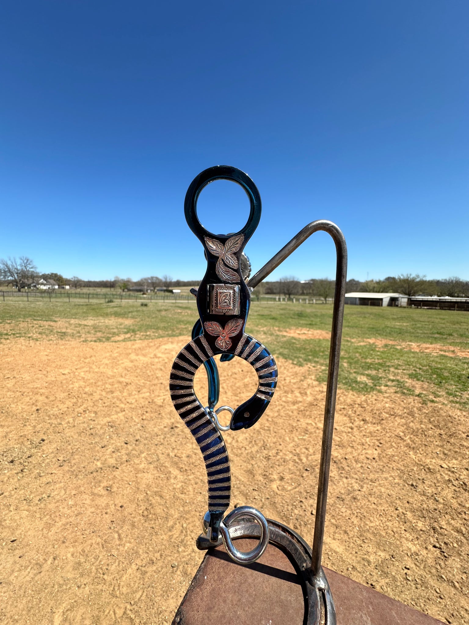 Snake designed shanks with a hooded half breed mouthpiece with straight bar and narrow hood, roller and lots of Silver inlaid on the cheeks. This is a Garcia bit that was sold by Capriola's at one time. The bars have copper inlays and the hood has some gorgeous floral detail etching. It's a real work of art with many details. The blued finish will oxidize and finish out rusted color with time and use. This is one only, we do not carry this bit regularly as you see it, for it is no longer in production.